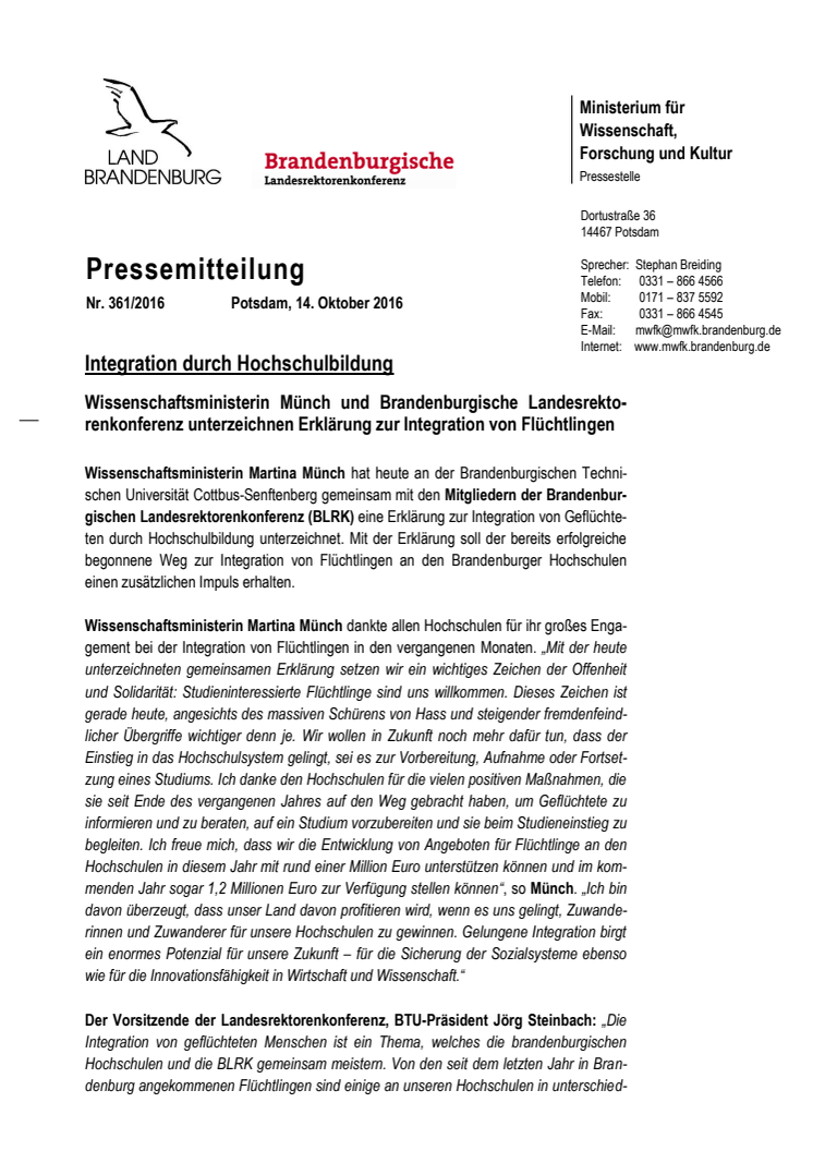 Wissenschaftsministerin Martina Münch und die Mitglieder der Brandenburgischen Landesrektorenkonferenz (BLRK) haben eine gemeinsame Erklärung zur Integration von Geflüchteten durch Hochschulbildung unterzeichnet. Mit der Erklärung soll der bereits erfolgreiche begonnene Weg zur Integration von Flüchtlingen an den Brandenburger Hochschulen einen zusätzlichen Impuls erhalten.