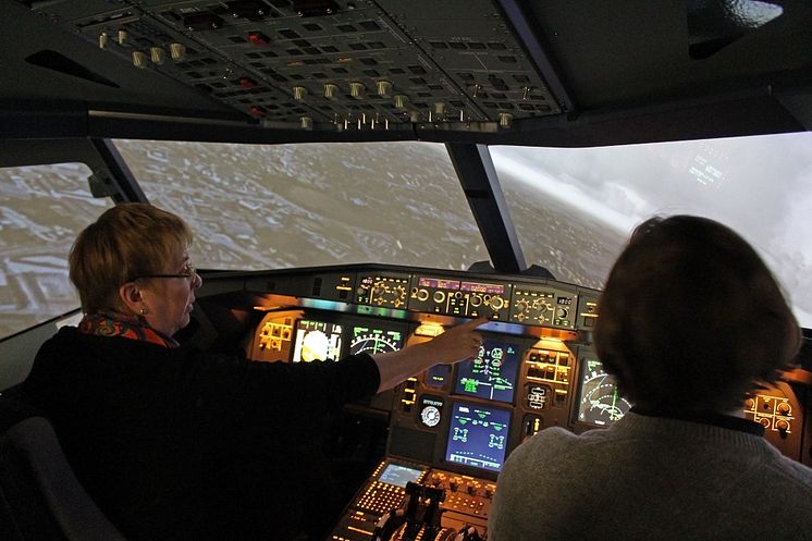 Bei einem Campusrundgang unternahm Frau Dr. Gutheil einen "Rundflug" im A320-Flugsimulator.
