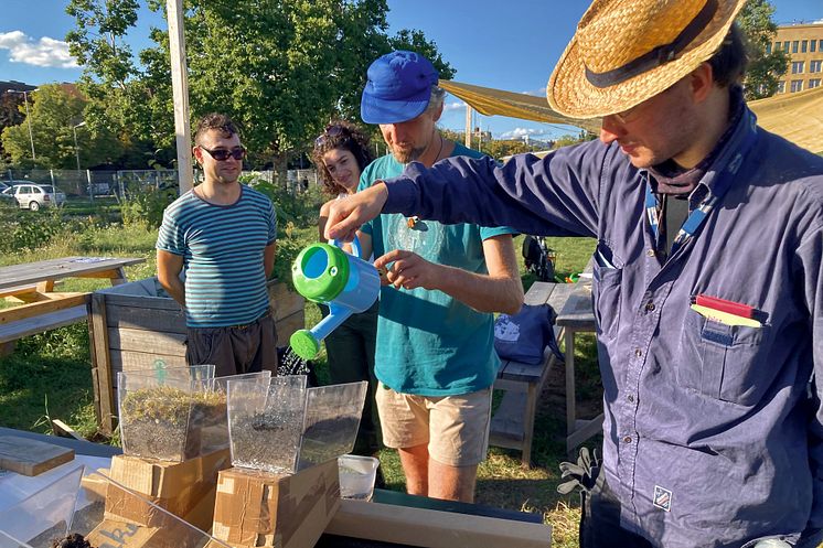 Ein Team präsentiert Experimente zur Bodenerosion.