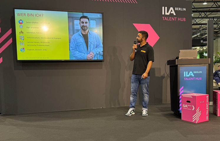 Luftfahrttechnik / Luftfahrtmanagement-Student Zabair Ghafoor von der TH Wildau bei seinem Vortrag auf der diesjährigen ILA in Berlin.