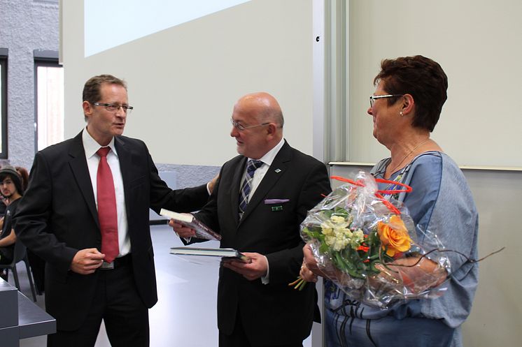 Der Präsident der Technischen Hochschule Wildau, Prof. Dr. László Ungvári, wurde anlässlich seines 60. Geburtstages auf Beschluss der Stadtverordnetenversammlung zum Ehrenbürger der Stadt Wildau ernannt. Bürgermeister Dr. Uwe Malich (l.) überreichte am 26. Mai 2015 gemeinsam mit der Vorsitzenden der Stadtverordnetenversammlung, Angela Homuth (r.), die Ehrenurkunde.
