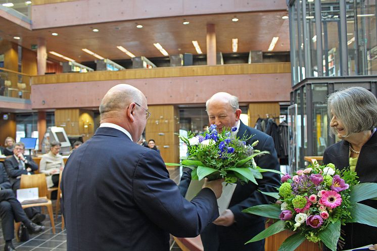Präsident Ungvári zeichnete die erste Kanzlerin Dr. Renate Wilde, und den Mitinitiator der ersten internationalen Hochschulkooperation Prof. Dr. József Tick (l.) (Óbuda Universität Budapest) mit der neuen Ehrenmedaille der TH Wildau aus