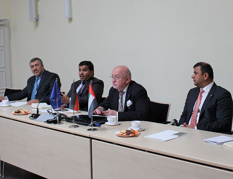 Seit Anfang März 2016 absolvieren 24 Studierende der in Abu Dhabi gegründeten Deutsch-Emiratischen Hochschule für Logistik (GUCL) ihr Auslandssemester in Wildau. Abdul Rahman Al Jahoushi, Direktor des Abu Dhabi Men’s College, (2.v.l.) an dem die GUCL angesiedelt ist, und Dr. Mohammad Al Jarrah, Dekan für Ingenieurwesen, (l.) informierten sich am 25. und 26. April 2016 über die Studieninhalte.