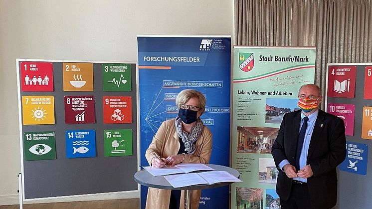 Zur Erreichung der Ziele geht Baruth auch strategische Partnerschaften ein. Zusammen mit der Technischen Hochschule Wildau (TH Wildau) sollen in Zukunft Synergien in den Bereichen Wissens- und Technologietransfer sowie der Aus- und Weiterbildung gebündelt werden. Passend zur bundesweiten Nachhaltigkeitswoche trafen sich am 21. September 2020 Vertreterinnen und Vertreter der Stadt und der Hochschule im Alten Schloss der Stadt Baruth/Mark. Prof. Dr. Ulrike Tippe, Präsidentin der TH Wildau, und Baruths Bürgermeister Peter Ilk unterzeichneten eine Kooperationsvereinbarung, die besagt, dass beispielsweise Fragestellungen in Form von studentischen Projekten oder Abschlussarbeiten bearbeitet werden. Die Themen stellt die Stadt und baut zudem Kontakte zu Unternehmen und wichtigen Institutionen der Region auf, die dann wiederum mit der TH Wildau in den engeren Austausch treten.