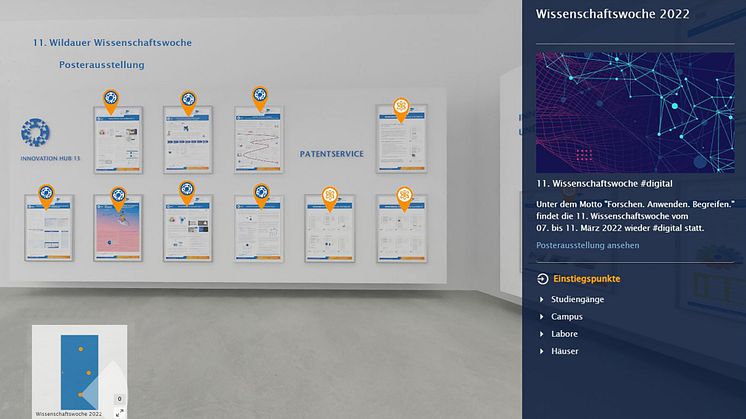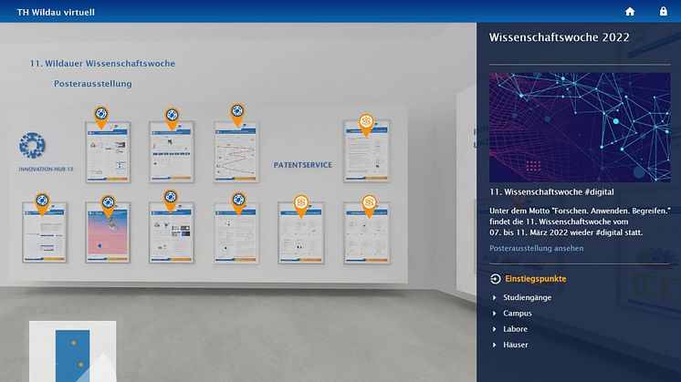 Die begleitende, digital begehbare Posterausstellung der Wildauer Wissenschaftswoche nahm die Gäste mit auf eine Reise durch die Forschungslandschaft der TH Wildau. Insgesamt 27 Forschungsgruppen gibt es an der Hochschule, verteilt auf sechs Forschungsfelder wie beispielsweise Angewandte Biowissenschaften, Produktion und Material sowie Verkehr und Logistik. Die Posterausstellung präsentierte mit 50 Beiträgen eine kleine Auswahl der aktuellen Forschungsprojekte. Der virtuelle Überblick, den sich in der vergangenen Woche über 200 Interessierte anschauten, ist nach wie vor unter www.th-wildau.de/wiwo zugänglich.