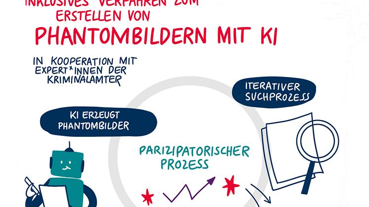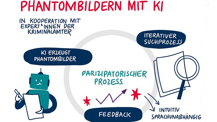 In Kooperation mit kriminaltechnischen Expertinnen und Experten entwickelt das Team ein innovatives und inklusives Verfahren zur Erstellung von Phantombildern. Mit bestehender generativer KI (StyleGAN) werden wiederholt fotorealistische Phantombilder erzeugt. Opfer und Zeugen betrachten diese, gleichen sie mit ihrer Erinnerung ab und bewerten sie. Anhand der Bewertungen wird die Bilderstellung durch die KI optimiert. Dieses Verfahren vereint innovative Technologie und Erkenntnisse der Wahrnehmungspsychologie in einem partizipativen Prozess. Die Opfer von Gewaltverbrechen können so sprachunabhängig und intuitiv Phantombilder erstellen.