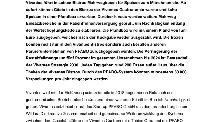 Vivantes führt in seinen Bistros Mehrwegboxen für Speisen zum Mitnehmen ein. Ab sofort können Gäste in den Bistros der Vivantes Gastronomie warme und kalte Speisen in einer Pfandbox des TH-Wildau-Start-ups PFABO GmbH erwerben. Durch das System könnten mindestens 30.000 Verpackungen pro Jahr eingespart werden. Darüber hinaus werden weitere Mehrweg-Einsatzbereiche in der Patient/-innenversorgung geprüft, um Nachhaltigkeit entlang der Wertschöpfungskette zu etablieren.