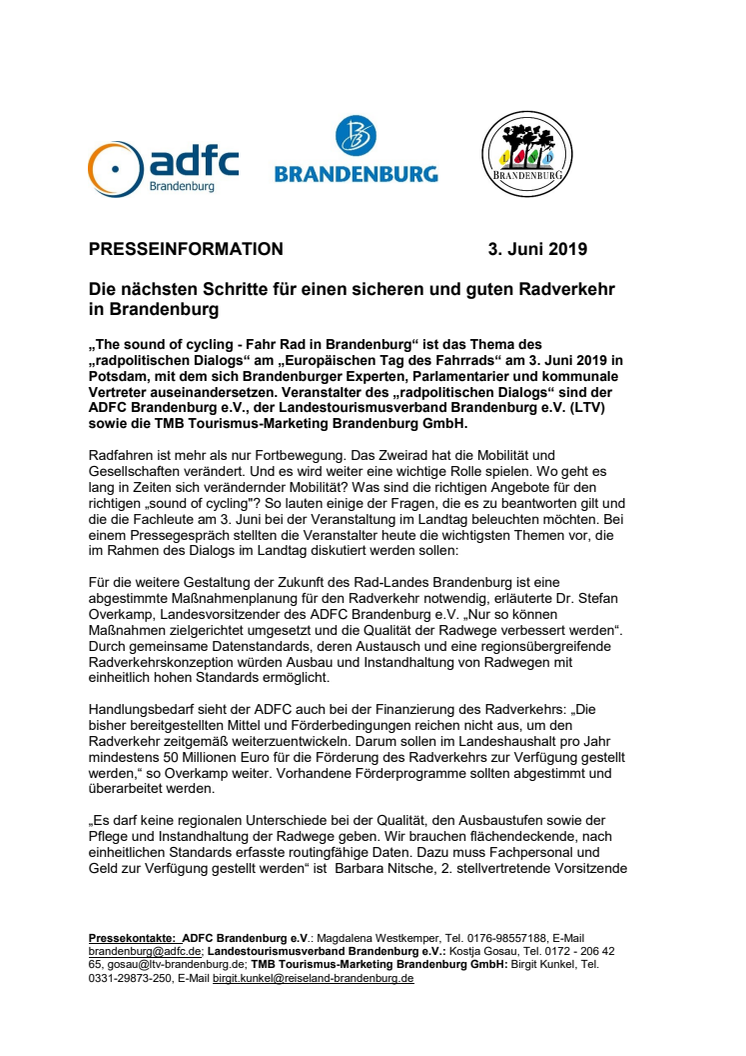 Bei einem Pressegespräch stellten der adfc Brandenburg e.V., der Landestourismusverband Brandenburg e.V. sowie die TMB Tourismus-Marketing Brandenburg GmbH die Themen des „radpolitischen Dialogs“ vor, der am 3. Juni 2019 im Landtag Potsdam stattfindet. Experten, Parlamentarier und kommunale Vertreter setzen sich dabei mit dem Radverkehr im Land auseinander.