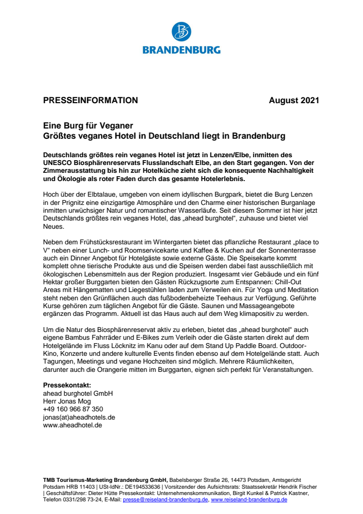 Deutschlands größtes rein veganes Hotel ist jetzt in Lenzen/Elbe, inmitten des UNESCO Biosphärenreservats Flusslandschaft Elbe, an den Start gegangen. Von der Zimmerausstattung bis hin zur Hotelküche zieht sich die konsequente Nachhaltigkeit und Ökologie als roter Faden durch das gesamte Hotelerlebnis.