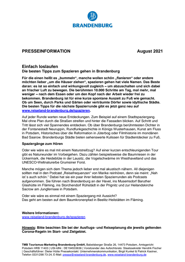 Für die einen heißt es „bummeln“, manche wollen schön „flanieren“ oder andere möchten lieber „um die Häuser ziehen“, spazieren gehen hat viele Namen. Das Beste daran: es ist so einfach und wirkungsvoll zugleich – um abzuschalten und sich dabei an frischer Luft zu bewegen. Brandenburg ist für eine kurze spontane Auszeit zu Fuß wie gemacht.