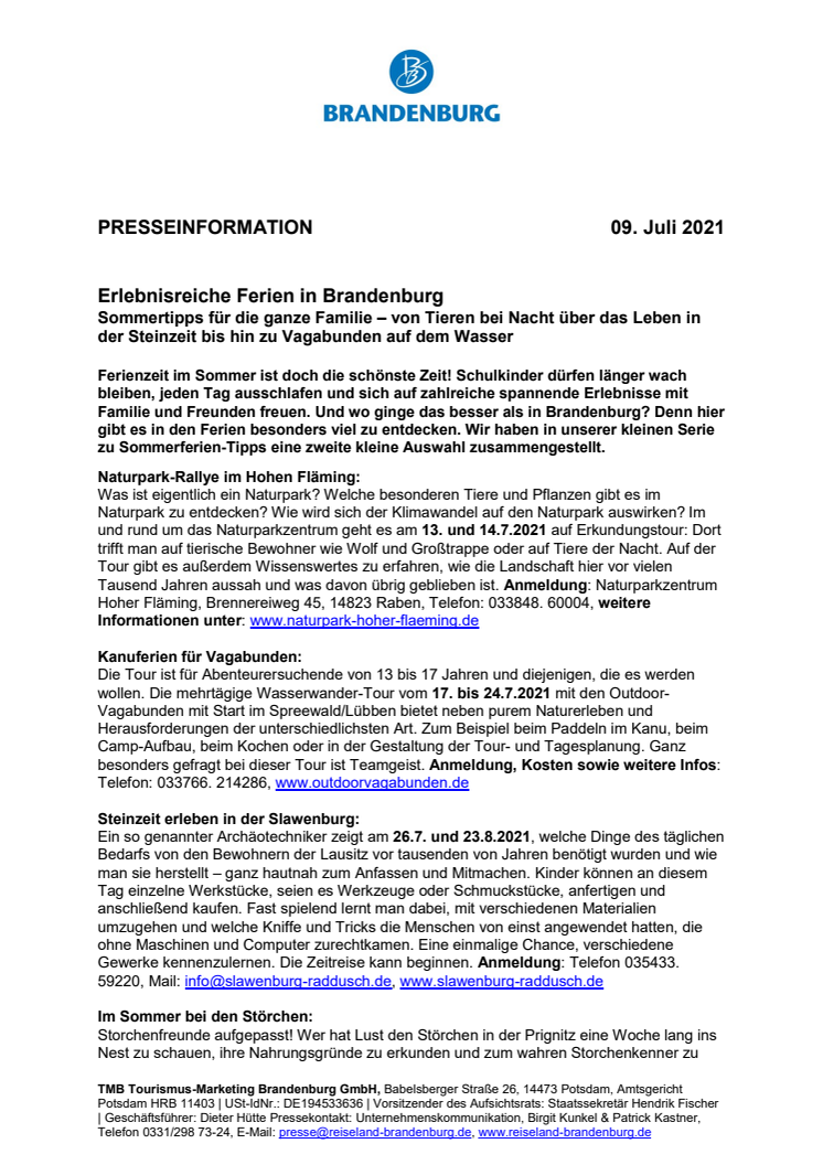 Ferienzeit im Sommer ist doch die schönste Zeit! Schulkinder dürfen länger wach bleiben, jeden Tag ausschlafen und sich auf zahlreiche spannende Erlebnisse mit Familie und Freunden freuen. Und wo ginge das besser als in Brandenburg? Denn hier gibt es in den Ferien besonders viel zu entdecken. Wir haben in unserer kleinen Serie zu Sommerferien-Tipps eine zweite kleine Auswahl zusammengestellt.