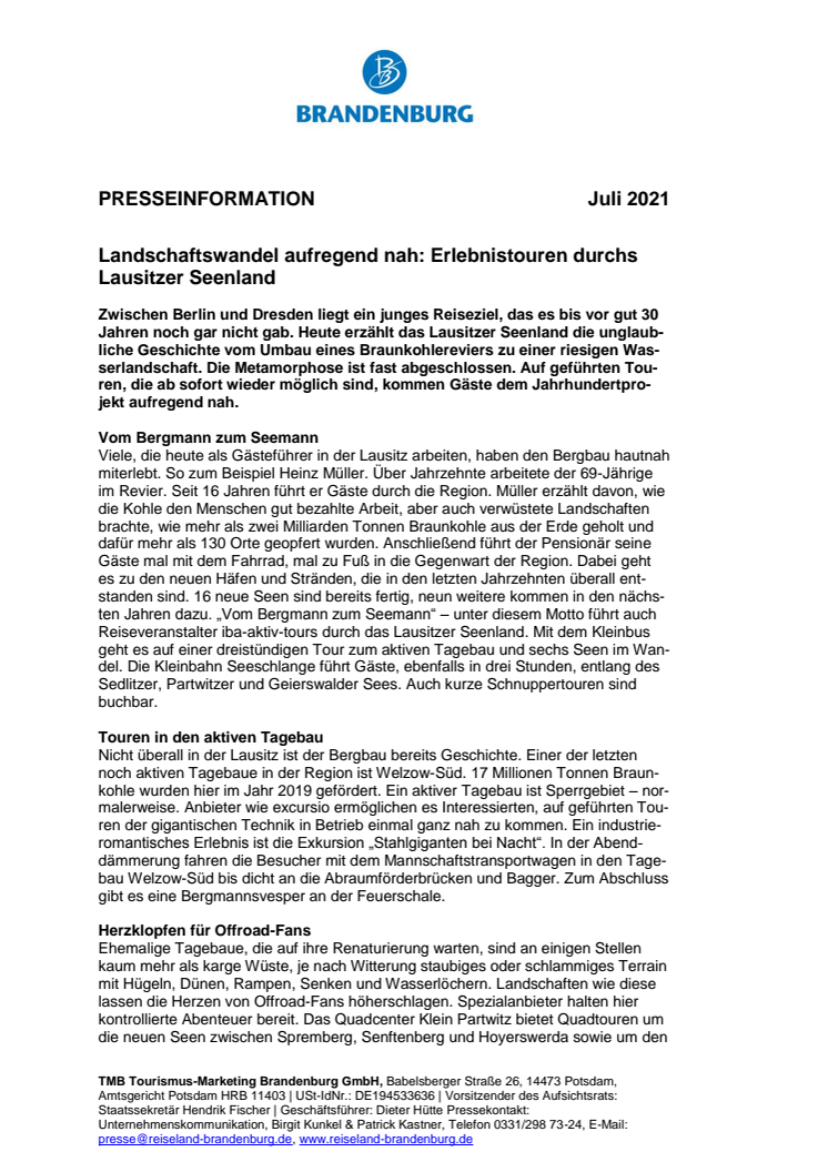 Zwischen Berlin und Dresden liegt ein junges Reiseziel, das es bis vor gut 30 Jahren noch gar nicht gab. Heute erzählt das Lausitzer Seenland die unglaubliche Geschichte vom Umbau eines Braunkohlereviers zu einer riesigen Wasserlandschaft. Die Metamorphose ist fast abgeschlossen. Auf geführten Touren, die ab sofort wieder möglich sind, kommen Gäste dem Jahrhundertprojekt auf-regend nah.