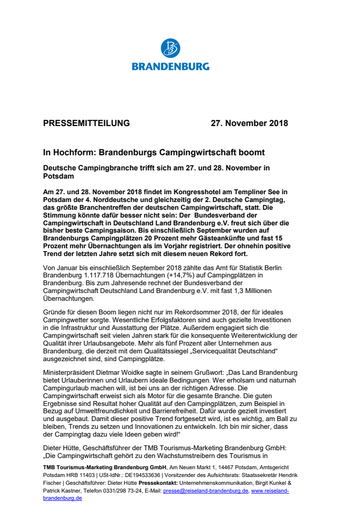Von Januar bis einschließlich September 2018 zählte das Amt für Statistik Berlin Brandenburg 1.117.718 Übernachtungen (+14,7%) auf Campingplätzen in Brandenburg. Bis zum Jahresende rechnet der Bundesverband der Campingwirtschaft Deutschland Land Brandenburg e.V. mit fast 1,3 Millionen Übernachtungen.