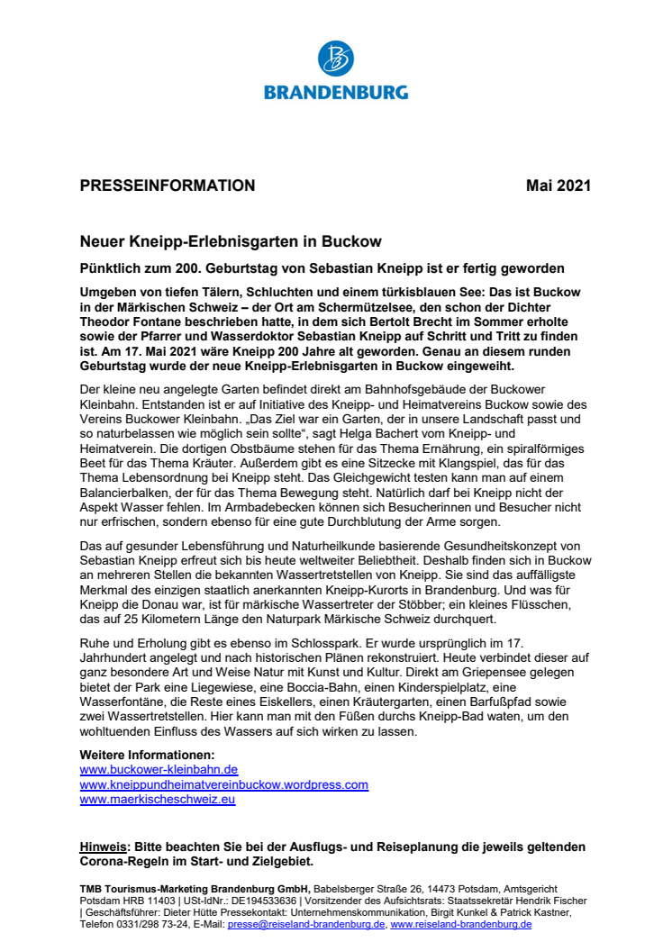 Umgeben von Tälern, Schluchten und einem türkisblauen See: Das ist Buckow in der Märkischen Schweiz – ein Ort, den schon Fontane beschrieb, in dem sich Brecht erholte sowie der Pfarrer und Wasserdoktor Sebastian Kneipp auf Schritt und Tritt zu finden ist. Am 17. Mai 2021 wäre Kneipp 200 Jahre alt geworden und genau an diesem Geburtstag wurde der neue Kneipp-Erlebnisgarten in Buckow eingeweiht.