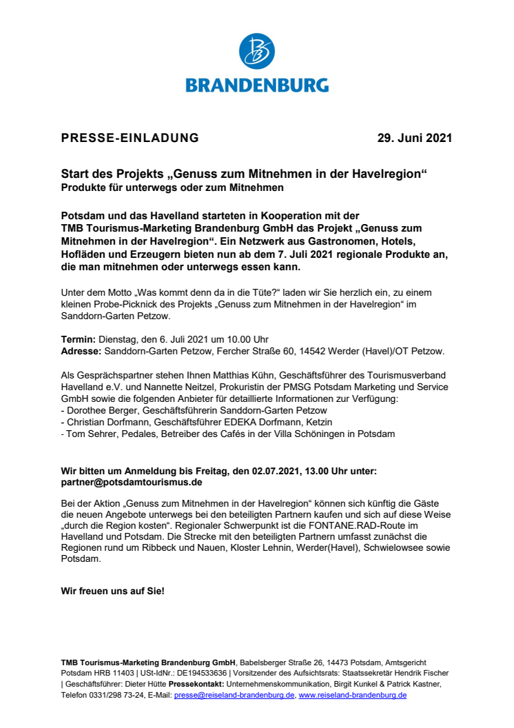 TMB Tourismus-Marketing Brandenburg GmbH das Projekt „Genuss zum Mitnehmen in der Havelregion“. Ein Netzwerk aus Gastronomen, Hotels, Hofläden und Erzeugern bieten nun ab dem 7. Juli 2021 regionale Produkte an, die man mitnehmen oder unterwegs essen kann.
