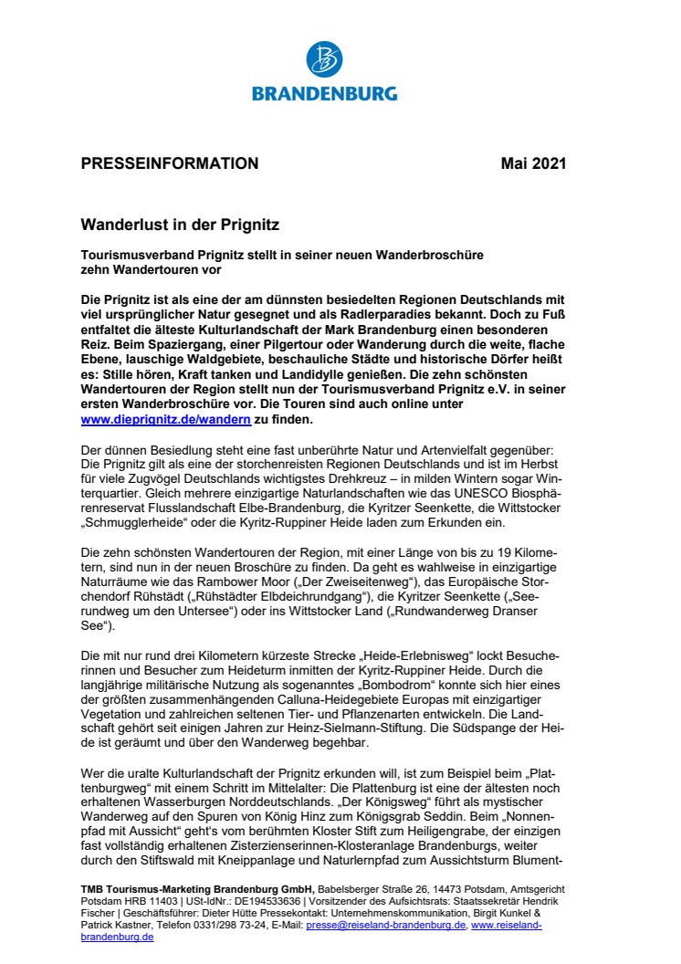 Beim Spaziergang, einer Pilgertour oder Wanderung durch Prignitz heißt es: Stille hören, Kraft tanken und Landidylle genießen. Die zehn schönsten Wandertouren der Region stellt nun der Tourismusverband Prignitz e.V. in seiner ersten Wanderbroschüre vor.