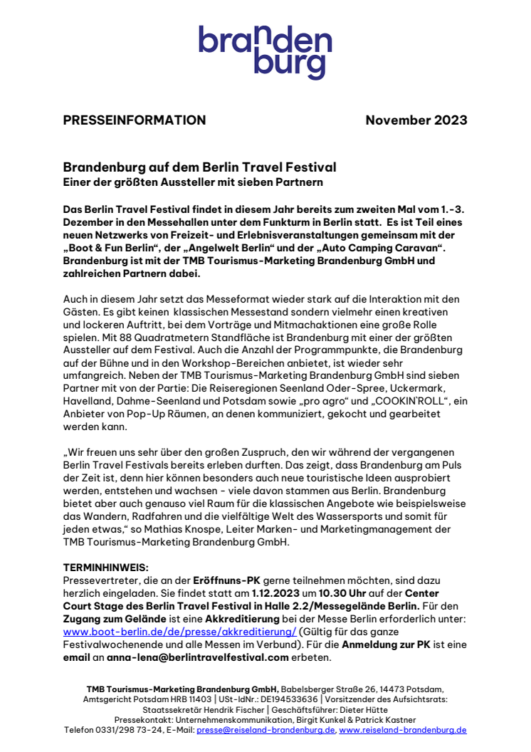 „Wir freuen uns sehr über den großen Zuspruch, den wir während der vergangenen Berlin Travel Festivals bereits erleben durften. Das zeigt, dass Brandenburg am Puls der Zeit ist, denn hier können besonders auch neue touristische Ideen ausprobiert werden, entstehen und wachsen - viele davon stammen aus Berlin. Brandenburg bietet aber auch genauso viel Raum für die klassischen Angebote wie beispielsweise das Wandern, Radfahren und die vielfältige Welt des Wassersports und somit für jeden etwas,“ so Mathias Knospe, Leiter Marken- und Marketingmanagement der TMB Tourismus-Marketing Brandenburg GmbH.
