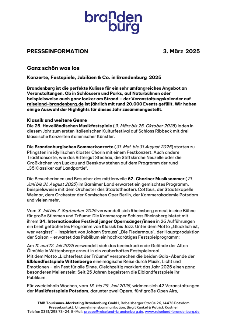 Konzerte, Festspiele, Jubiläen & Co. in Brandenburg 2025