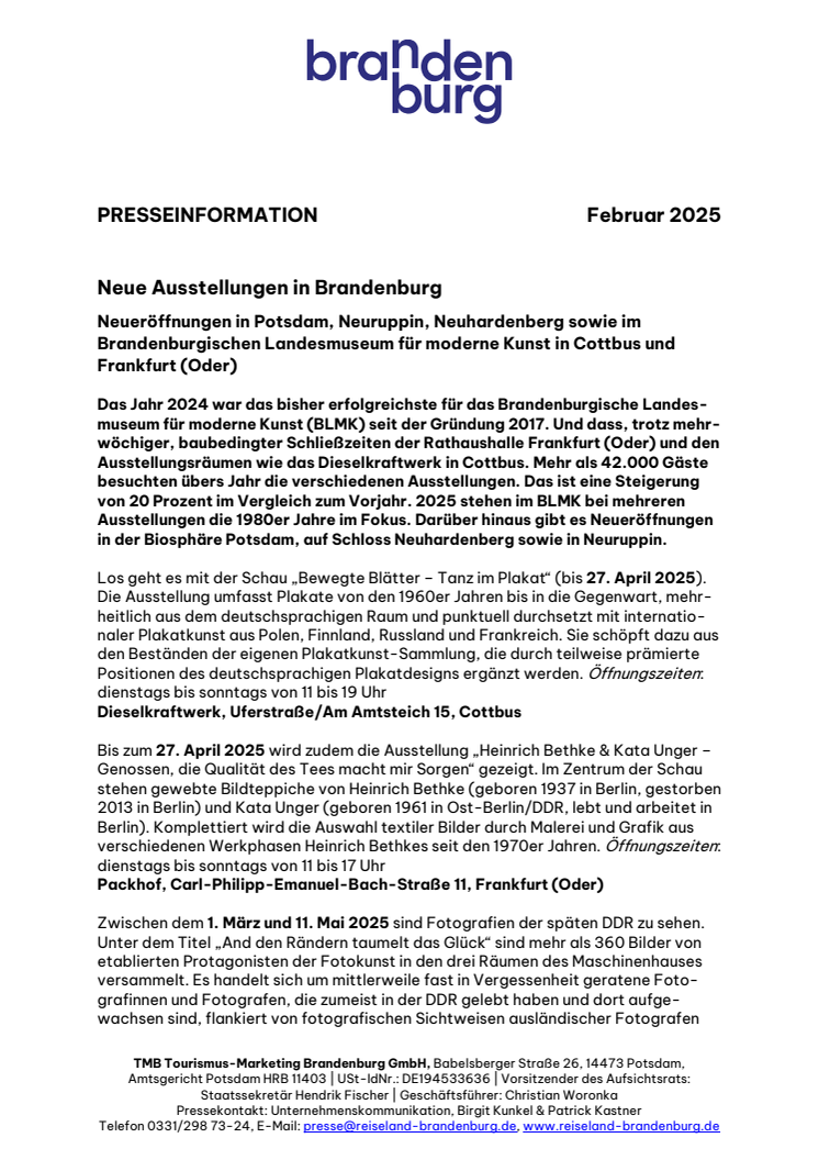 Neue Ausstellungen: Das Jahr 2024 war das bisher erfolgreichste für das Brandenburgische Landesmuseum für moderne Kunst (BLMK) seit der Gründung 2017. Mehr als 42.000 Gäste besuchten übers Jahr die verschiedenen Ausstellungen. Das ist eine Steigerung von 20 Prozent im Vergleich zum Vorjahr. Darüber hinaus stehen dieser Tage Neueröffnungen in der Biosphäre Potsdam, auf Schloss Neuhardenberg sowie in Neuruppin an.