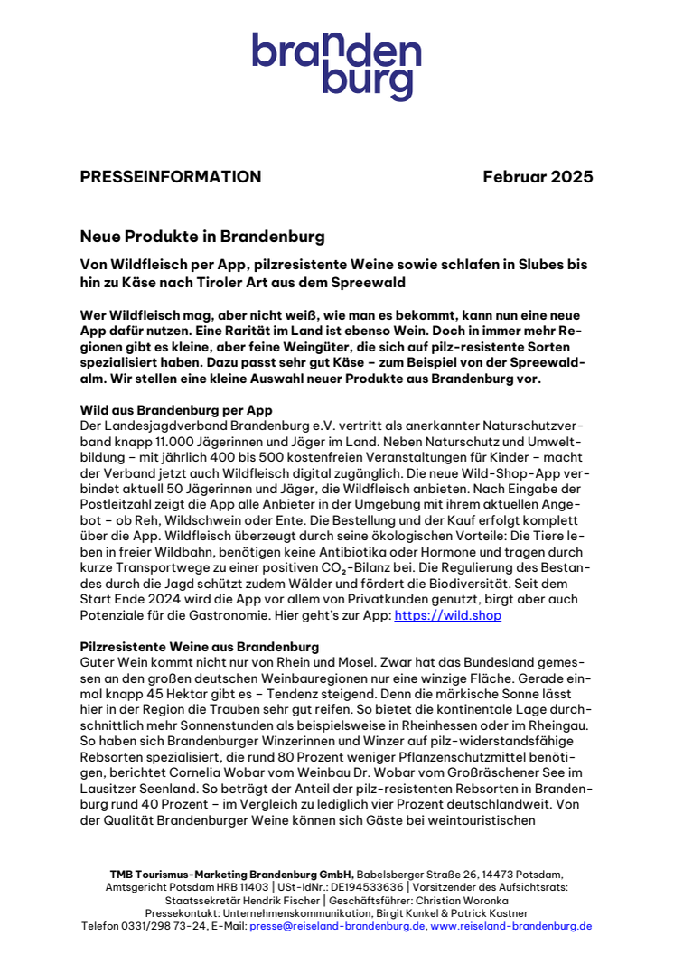 Kulinarisch geht es weiter: Wer Wildfleisch mag, aber nicht weiß, wie man es bekommt, kann nun eine neue App dafür nutzen. Eine Rarität im Land ist ebenso Wein. Doch in immer mehr Regionen gibt es kleine, aber feine Weingüter, die sich auf pilz-resistente Sorten spezialisiert haben. Dazu passt sehr gut Käse – zum Beispiel von der Spreewaldalm. Wir stellen eine kleine Auswahl neuer Produkte aus Brandenburg vor.