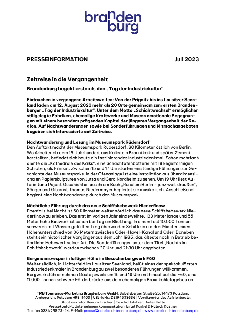 Von der Prignitz bis ins Lausitzer Seenland laden am 12. August 2023 mehr als 20 Orte gemeinsam zum ersten Brandenburger „Tag der Industriekultur“. Unter dem Motto „Schichtwechsel“ ermöglichen stillgelegte Fabriken, ehemalige Kraftwerke und Museen emotionale Begegnungen mit einem besonders prägenden Kapitel der jüngeren Vergangenheit der Regionen.