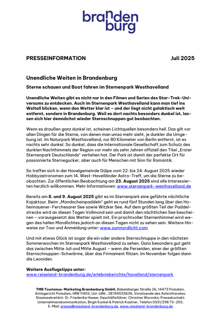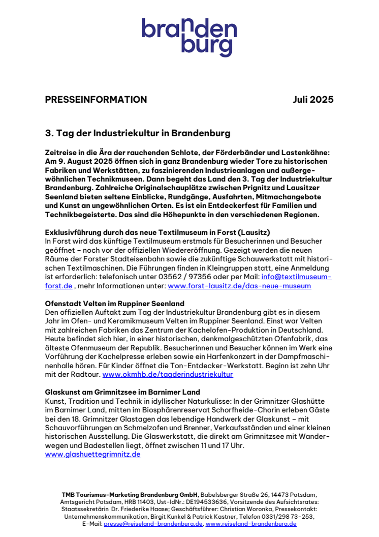 TMB Tourismus-Marketing Brandenburg GmbH, Babelsberger Straße 26, 14473 Potsdam