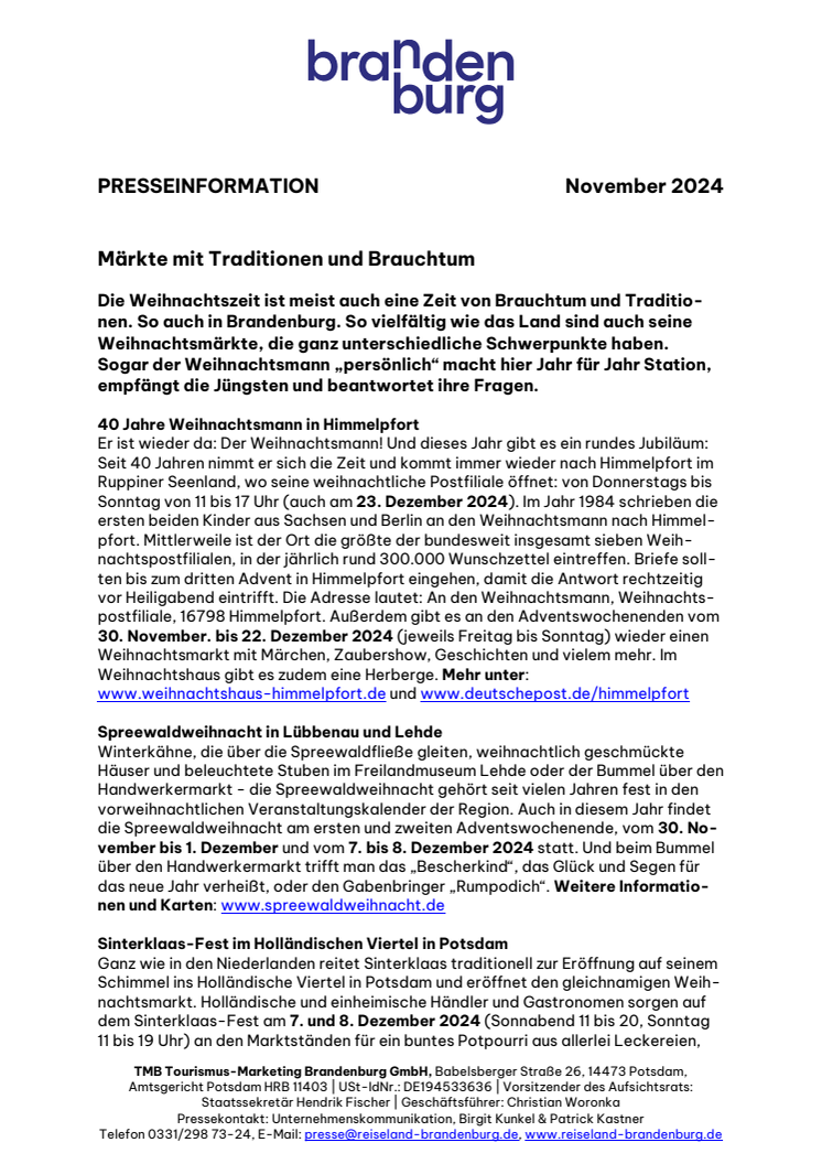 Bald schon beginnt die Weihnachtszeit, die vieler Orts auch eine Zeit von Brauchtum und Traditionen ist. So auch in Brandenburg. Die Weihnachtsmärkte haben dennoch ganz unterschiedliche Schwerpunkte. Sogar der Weihnachtsmann „persönlich“ macht hier Jahr für Jahr Station, empfängt die Jüngsten und beantwortet ihre Fragen.