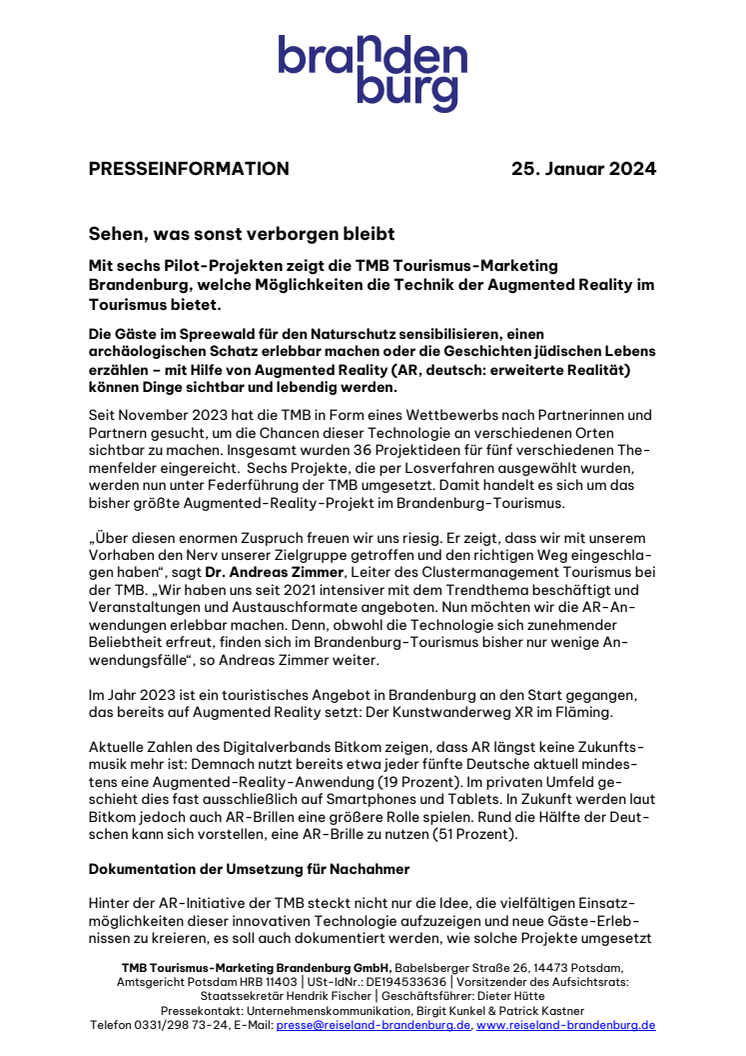 „Über diesen enormen Zuspruch freuen wir uns riesig. Er zeigt, dass wir mit unserem Vorhaben den Nerv unserer Zielgruppe getroffen und den richtigen Weg eingeschlagen haben“, sagt Dr. Andreas Zimmer, Leiter des Clustermanagement Tourismus bei der TMB. „Wir haben uns seit 2021 intensiver mit dem Trendthema beschäftigt und Veranstaltungen und Austauschformate angeboten. Nun möchten wir die AR-Anwendungen erlebbar machen. Denn, obwohl die Technologie sich zunehmender Beliebtheit erfreut, finden sich im Brandenburg-Tourismus bisher nur wenige Anwendungsfälle“, so Andreas Zimmer weiter.