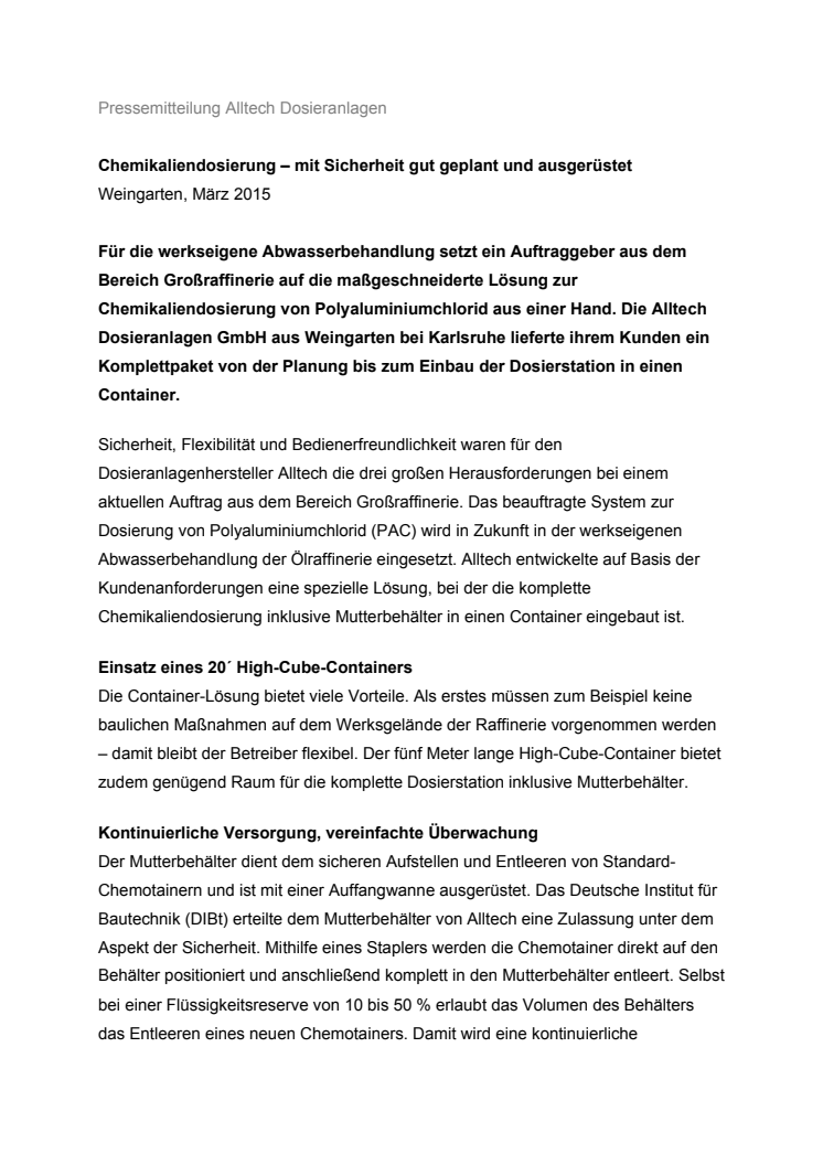 Für die werkseigene Abwasserbehandlung setzt ein Auftraggeber aus dem Bereich Großraffinerie auf die maßgeschneiderte Lösung zur Chemikaliendosierung von Polyaluminiumchlorid aus einer Hand. Die Alltech Dosieranlagen GmbH aus Weingarten bei Karlsruhe lieferte ihrem Kunden ein Komplettpaket von der Planung bis zum Einbau der Dosierstation in einen Container.