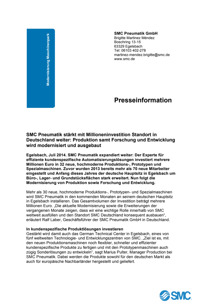 SMC Pneumatik stärkt mit Millioneninvestition Standort in Deutschland