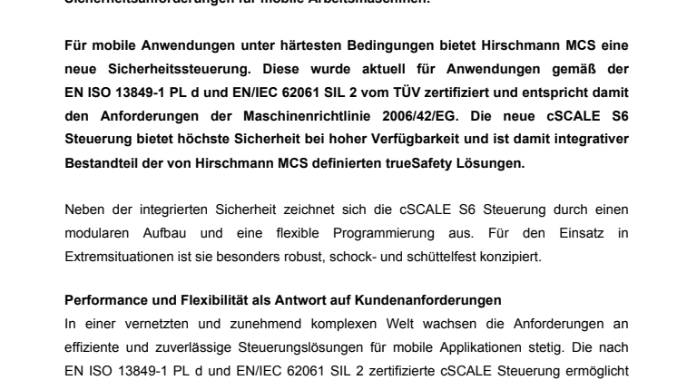 EN ISO 13849-1 PL d und EN/IEC 62061 SIL 2 vom TÜV zertifiziert und entspricht damit den Anforderungen der Maschinenrichtlinie 2006/42/EG. Die neue cSCALE S6 Steuerung bietet höchste Sicherheit bei hoher Verfügbarkeit und ist damit integrativer Bestandteil der von Hirschmann MCS definierten trueSafety Lösungen.