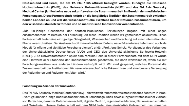 „Die 60-jährige Geschichte der deutsch-israelischen Beziehungen begann mit einer engen Zusammenarbeit im Bereich der Forschung. An diese Tradition wollen wir gemeinsam anknüpfen. Diese Partnerschaft bietet eine einzigartige Gelegenheit, Wissenschaft und Forschung auf einer internationalen Ebene voranzutreiben. Der Austausch soll innovative Ideen fördern, neue Erkenntnisse liefern und auch als Modell für offene und vielfältige Forschung dienen“, erklärt Prof. Jens Scholz, Vorsitzender des Verbandes der Universitätsklinika Deutschlands (VUD) und CEO des Universitätsklinikums Schleswig-Holstein (UKSH). „Die Universitätsmedizin spielt eine zentrale Rolle in dieser Partnerschaft. Mit dem NUM wurde eine Plattform aller Standorte der Hochschulmedizin geschaffen, die noch wertvoller ist, wenn sie mit Forschungsansätzen aus anderen Ländern verknüpft wird. Wir sind gespannt, welches Potenzial die Zusammenarbeit der Institutionen für neue wissenschaftliche Erkenntnisse und eine bessere Versorgung der Patientinnen und Patienten entfalten wird.“