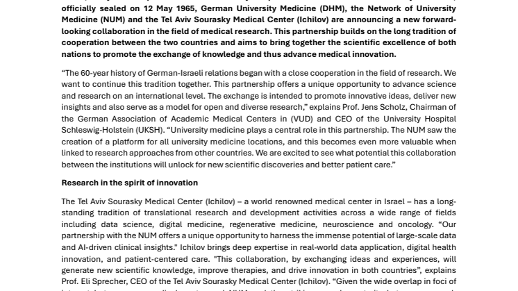 Gemeinsame Pressemitteilung der Deutschen Hochschulmedizin, des Netzwerkes Universitätsmedizin und des Tel Aviv Sourasky Medical Center (Ichilov) anlässlich des 60-jährigen Jubiläums der diplomatischen Beziehungen zwischen Deutschland und Israel