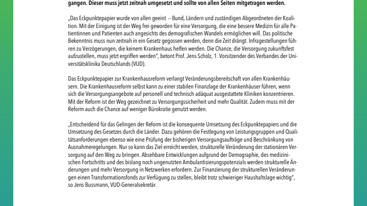„Das Eckpunktepapier wurde von allen geeint — Bund, Ländern und zuständigen Abgeordneten der Koalition. Mit der Einigung ist der Weg frei geworden für eine Versorgung, die eine bessere Medizin für alle Patientinnen und Patienten auch angesichts des demografischen Wandels ermöglichen will. Das politische Bekenntnis muss nun zeitnah in ein Gesetz gegossen werden, denn die Zeit drängt. Infragestellungen führen zu Verzögerungen, die keinem Krankenhaus helfen werden. Die Chance, die Versorgung zukunftsfest aufzustellen, muss jetzt ergriffen werden“, betont Prof. Jens Scholz, 1. Vorsitzender des Verbandes der Universitätsklinika Deutschlands (VUD).