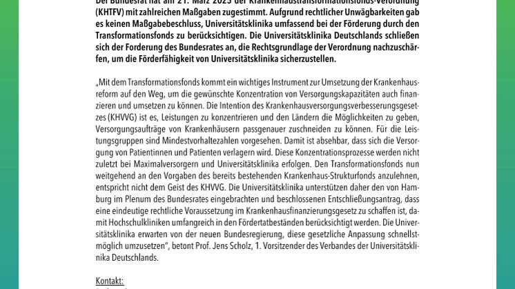 „Mit dem Transformationsfonds kommt ein wichtiges Instrument zur Umsetzung der Krankenhausreform auf den Weg, um die gewünschte Konzentration von Versorgungskapazitäten auch finanzieren und umsetzen zu können. Die Intention des Krankenhausversorgungsverbesserungsgesetzes (KHVVG) ist es, Leistungen zu konzentrieren und den Ländern die Möglichkeiten zu geben, Versorgungsaufträge von Krankenhäusern passgenauer zuschneiden zu können. Für die Leistungsgruppen sind Mindestvorhaltezahlen vorgesehen. Damit ist absehbar, dass sich die Versorgung von Patientinnen und Patienten verlagern wird. Diese Konzentrationsprozesse werden nicht zuletzt bei Maximalversorgern und Universitätsklinika erfolgen. Den Transformationsfonds nun weitgehend an den Vorgaben des bereits bestehenden Krankenhaus-Strukturfonds anzulehnen, entspricht nicht dem Geist des KHVVG. Die Universitätsklinika unterstützen daher den von Hamburg im Plenum des Bundesrates eingebrachten und beschlossenen Entschließungsantrag, dass eine eindeutige rechtliche Voraussetzung im Krankenhausfinanzierungsgesetz zu schaffen ist, damit Hochschulkliniken umfangreich in den Fördertatbeständen berücksichtigt werden. Die Universitätsklinika erwarten von der neuen Bundesregierung, diese gesetzliche Anpassung schnellstmöglich umzusetzen“, betont Prof. Jens Scholz, 1. Vorsitzender des Verbandes der Universitätsklinika Deutschlands.