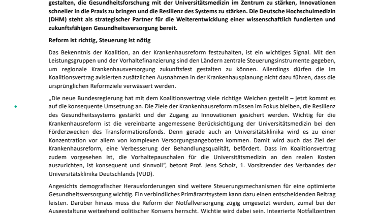 Mit dem Amtsantritt der neuen Bundesregierung bietet sich die Chance, den Gesundheits- und Forschungsstandort Deutschland in den kommenden Jahren gezielt weiterzuentwickeln. Der Koalitionsvertrag enthält zahlreiche richtige Ansätze, um die Gesundheitsversorgung zielgenauer zu gestalten, die Gesundheitsforschung mit der Universitätsmedizin im Zentrum zu stärken, Innovationen schneller in die Praxis zu bringen und die Resilienz des Systems zu stärken. Die Deutsche Hochschulmedizin (DHM) steht als strategischer Partner für die Weiterentwicklung einer wissenschaftlich fundierten und zukunftsfähigen Gesundheitsversorgung bereit.