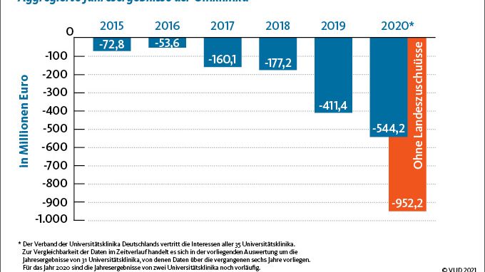 Für die deutschen Universitätsklinika war das Corona-Jahr 2020 auch finanziell ein schwieriges Jahr. Die aggregierten Jahresergebnisse 2020 der Uniklinika weisen ein Rekorddefizit von rund 544 Millionen Euro aus.[1]Ohne die zusätzliche Unterstützung der Länder hätte das Defizit sogar fast eine Milliarde Euro betragen.