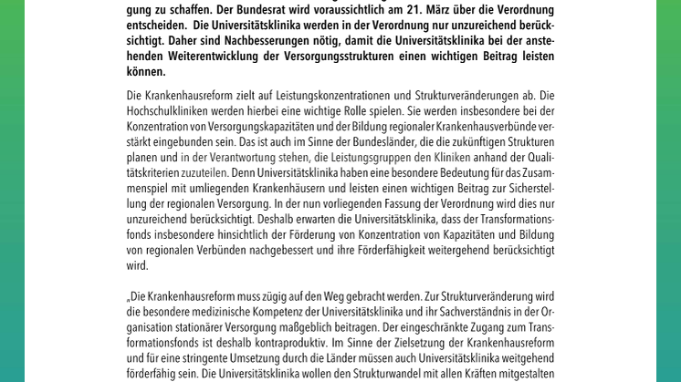 Der Transformationsfonds ist ein wichtiges Instrument, den notwendigen Strukturwandel im Krankenhausbereich zu fördern und gleichzeitig Strukturen für eine bessere Versorgung zu schaffen. Der Bundesrat wird voraussichtlich am 21. März über die Verordnung entscheiden. Die Universitätsklinika werden in der Verordnung nur unzureichend berücksichtigt. Daher sind Nachbesserungen nötig, damit die Universitätsklinika bei der anstehenden Weiterentwicklung der Versorgungsstrukturen einen wichtigen Beitrag leisten können.