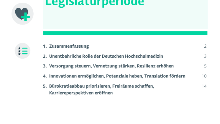 Die universitätsmedizinische Aufgabentrias von Forschung, Lehre und Krankenversorgung gilt es auch in der kommenden Legislatur zu stärken. Die Deutsche Hochschulmedizin, der Zusammenschluss der Universitätsklinika und der Medizinischen Fakultäten in Deutschland, macht das Angebot, die Hochschulmedizin mit ihren System- und Zukunftsaufgaben für das gesamte Gesundheits-, Wissenschafts- und Wirtschaftssystem zu nutzen.