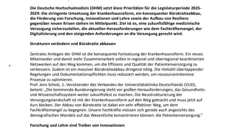Die Deutsche Hochschulmedizin (DHM) setzt klare Prioritäten für die Legislaturperiode 2025-2029: Die stringente Umsetzung der Krankenhausreform, ein konsequenter Bürokratieabbau, die Förderung von Forschung, Innovationen und Lehre sowie der Aufbau von Resilienz gegenüber neuen Krisen stehen im Mittelpunkt. Ziel ist es, eine zukunftsfähige medizinische Versorgung sicherzustellen, die aktuellen Herausforderungen wie dem Fachkräftemangel, der Digitalisierung und den steigenden Anforderungen an die Versorgung gerecht wird.