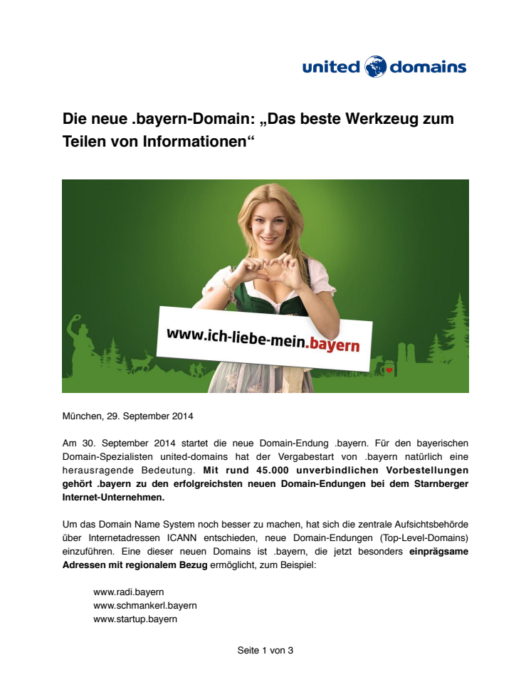 Am 30. September 2014 startet die neue Domain-Endung .bayern. Für den bayerischen Domain-Spezialisten united-domains hat der Vergabestart von .bayern natürlich eine herausragende Bedeutung. Mit rund 45.000 unverbindlichen Vorbestellungen gehört .bayern zu den erfolgreichsten neuen Domain-Endungen bei dem Starnberger Internet-Unternehmen.