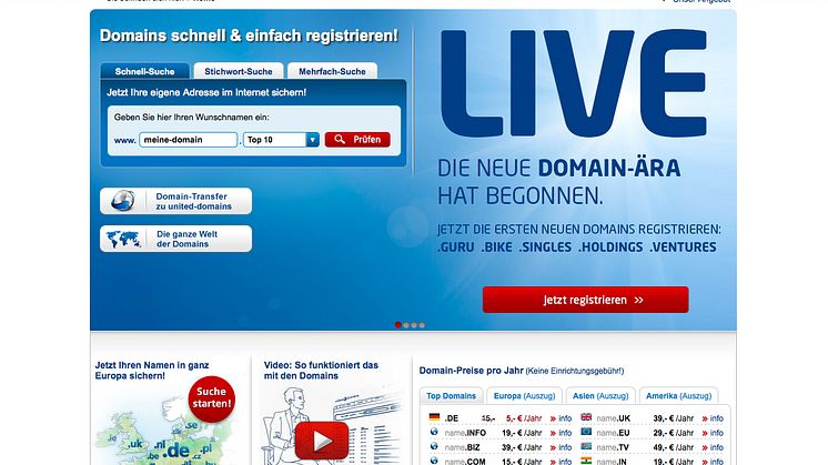 Die besten Adressen fürs Web: Die united-domains AG (www.united-domains.de) mit Sitz in Starnberg bei München ist mit mehr als 1,5 Millionen registrierten Domains und mehr als 250.000 zufriedenen Kunden einer der führenden Domain-Registrare in Europa. Zu ihren Kunden zählen renommierte Unternehmen wie Mövenpick, DEVK, Fielmann und E-Plus. Sie können Ihre Adressen aus mehr als 270 verschiedenen Domain-Endungen von .ag wie Antigua bis .za für Südafrika auswählen. Zudem bietet united-domains seit Anfang 2012 die Möglichkeit, Wunsch-Domains unter den neuen Domain-Endungen (new gTLDs) wie .web oder .shop kostenlos und unverbindlich in ihren Datenbanken vorzubestellen. Die united-domains AG wurde im August 2000 von Florian Huber, Alexander Helm und Markus Eggensperger gegründet und beschäftigt etwa 85 Mitarbeiter an den Standorten Starnberg und Boston (USA). Seit Anfang 2009 ist die United Internet Gruppe (1&1, GMX, WEB.DE u. a.) mehrheitlich an der united-domains AG beteiligt.