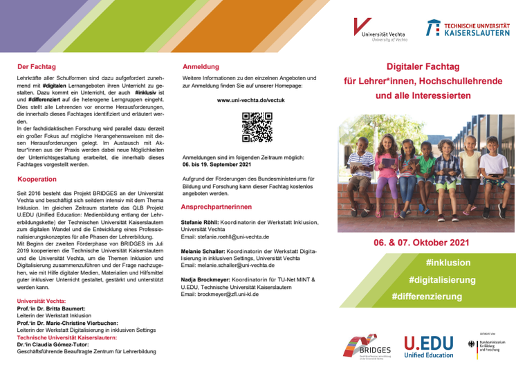 Die BRIDGES-Werkstätten „Inklusion“ und „Digitalisierung in inklusiven Settings“ der Universität Vechta laden zum Fachtag für (angehende) Lehrende aller Schulformen ein, von der Grundschule bis zur Universität. Gemeinsam mit dem Projekt „U.EDU“ der Technischen Universität Kaiserslautern werden am 6. und 7. Oktober 2021 unterschiedliche Workshops, eine Podiumsdiskussion und zwei Keynotes zu aktuell