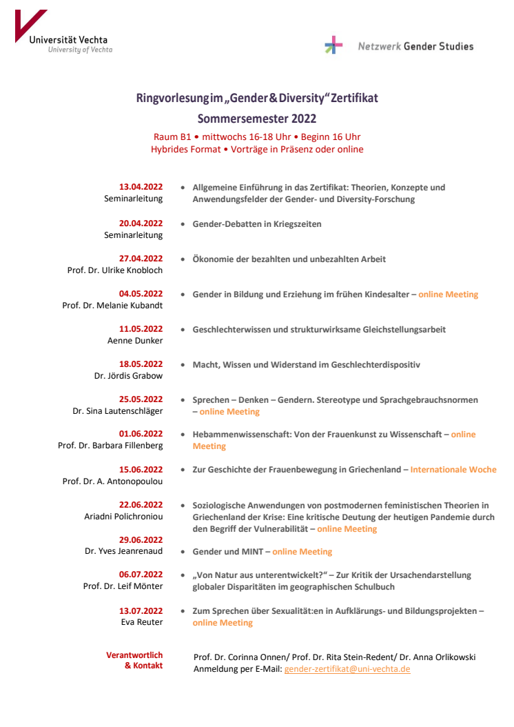 Die Universität Vechta bietet – im Rahmen des Gender & Diversity Zertifikats – im Sommersemester 2022 zum sechsten Mal eine öffentliche Ringvorlesung als Einführung in die Theorien, Konzepte und Anwendungsfelder der Gender- und Diversityforschung an.