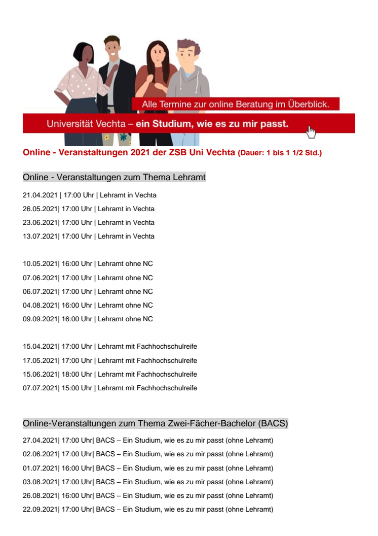 Lehramtsstudium, Bachelor- und Masterabschlüsse in allen angebotenen Fächern, Vereinbarkeit von Studium und Familie oder studieren ohne Abitur – das sind einige Themen der digitalen Hochschulinformationswochen 2021 der Universität Vechta. Innerhalb dieser bietet das Team der Zentrale Studienberatung (ZSB) bis zum kommenden Wintersemester ein kostenloses Online-Informations- und Beratungsprogramm.
