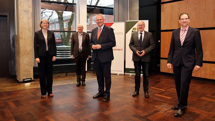 v.l.n.r. Die Präsidentin der Universität Vechta, Prof.' Dr.'in Verena Pietzner, CDU-Landtagsabgeordneter, Dr. Stephan Siemer, Niedersachsens Minister für Wissenschaft und Kultur, Björn Thümler, der Präsident der Hochschule Emden/Leer, Prof. Dr. Gerhard Kreutz und der Vizepräsident für Forschung der Jade Hochschule, Prof. Dr. Holger Saß bei der Bewilligungs-Übergabe für das Forschungsprojekt 4N in der Universität Vechta.
