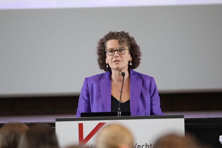 Petra Hense, Oberschuldirektorin der Anna-Frank-Schule in Molbergen. - Migrations- und Fluchterfahrungen haben Einfluss auf die Leistung von Schülerinnen und Schülern. Dass diese nicht nur negative Auswirkung haben, sondern auch bereichern können hat der Pädagogische Tag 2023 des Zentrums für Lehrer*innenbildung (ZfLB) an der Universität Vechta gezeigt. Neben Impulsvorträgen von Prof. Dr. Karim Fereidooni von der Ruhr-Universität Bochum und Oberschuldirektorin Petra Hensen von der Anne-Frank-Schule Molbergen hat es Workshops und Poster-Präsentationen für die rund 250 Teilnehmenden vor Ort gegeben. Weitere 50 Teilnehmende verfolgten den Livestream des diesjährigen Pädagogischen Tages unter dem Titel „Schüler*innen mit Migrations- und/oder Fluchterfahrung am Lernort Schule begleiten“.
