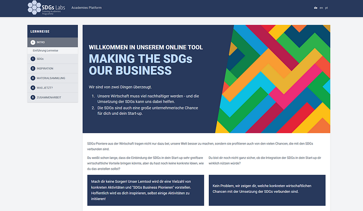 Aufbauend auf den Ergebnissen der SDGs Labs wurde die „SDGs Akademie“ (sdgs-academies.eu) mit zwei Bausteinen entwickelt, die Unternehmen die Möglichkeit geben, sich grundlegende oder erweiterte Kenntnisse zu den Nachhaltigkeitszielen und der Integration in die eigenen Geschäftsmodelle anzueignen.