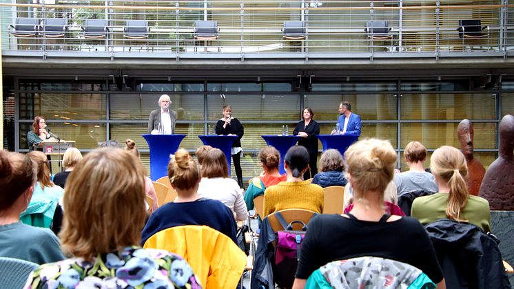 Podiumsdiskussion der „IfG-Summer School“ im Foyer des Rathauses der Stadt Vechta. Teilnehmende: Prof. Dr. Harald Künemund (Uni Vechta), Dr.in Laura Naegele (Uni Vechta), Prof.in Dr.in Claudia Vogel (Hochschule Neubrandenburg), Prof. Dr. Andrea Teti (Universität Vechta)
