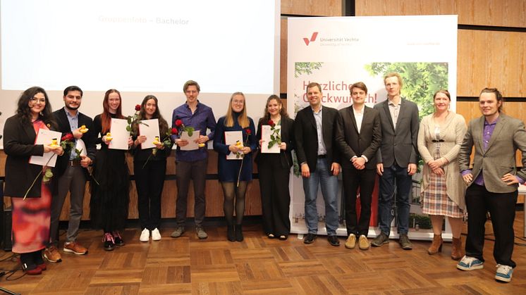 Sie haben den Titel in der Tasche: Die Universität Vechta hat zu den Abschlussfeiern der Studiengänge Bachelor Combined Studies (BACS), Master of Education (M.Ed.) und Master im Fach Kulturwissenschaften eingeladen. Fast 200 der Absolvent*innen fanden nun erneut den Weg in die Aula der Universität Vechta und nahmen an insgesamt zwei Bachelor- sowie einer Master-Veranstaltung teil. Familien, Freunde und Freundinnen feierten mit ihnen. Für musikalische Unterhaltung sorgte „Ein Quartett“; durch den Abend führten Katharina Genn-Blümlein und Simone Rohe aus dem Team Marketing und Kommunikation der Universität Vechta.